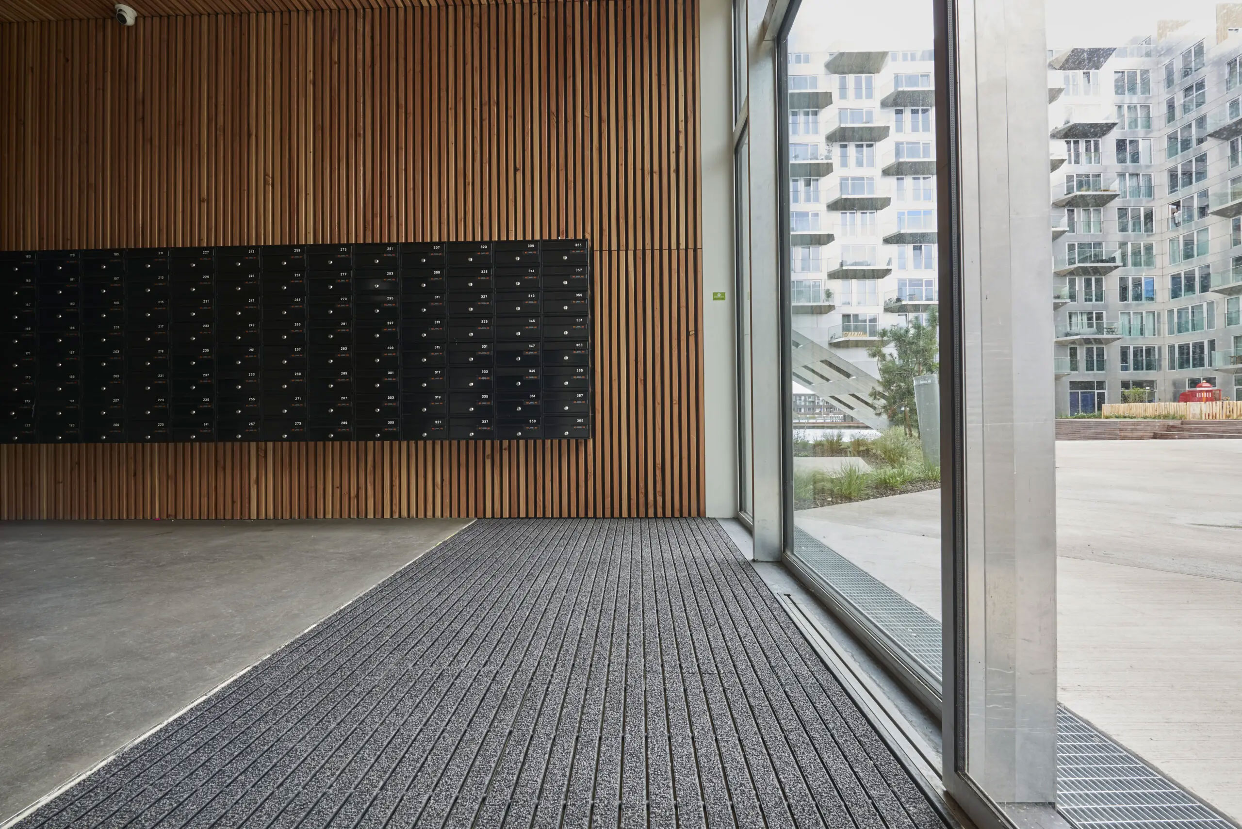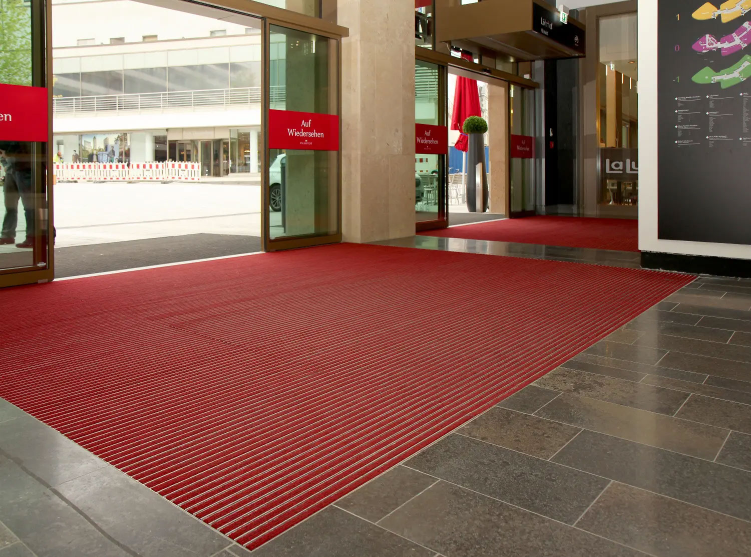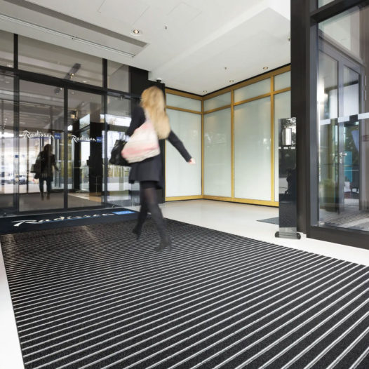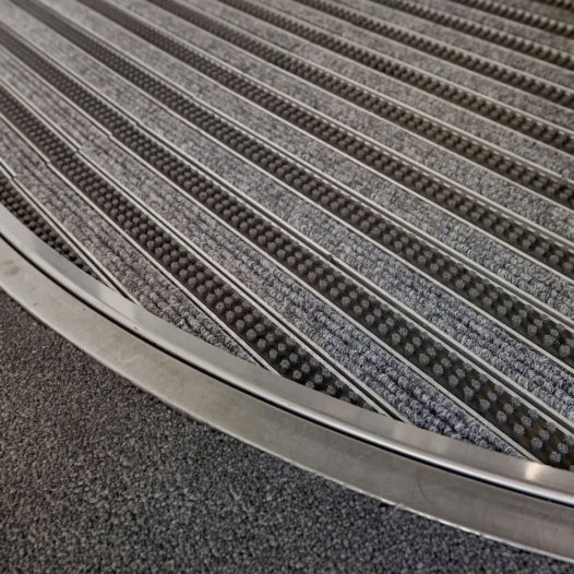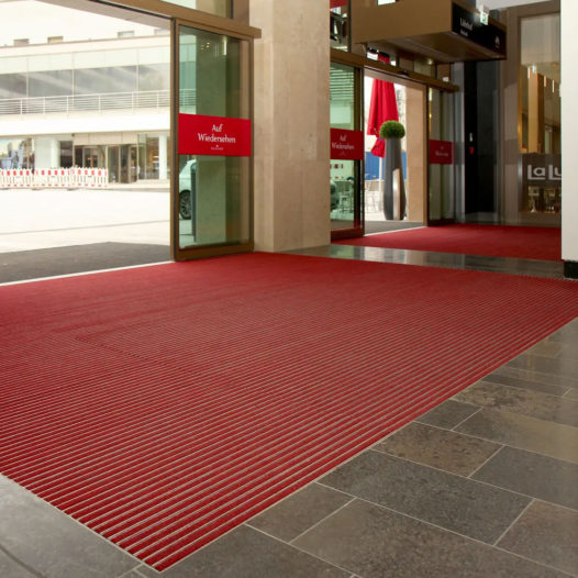 ドイツトップシェアの高性能エントランスマット。建物の出入口に設置して屋内への汚れの持ち込みをコントロールする高機能くつ拭きマットは、1つ1つカスタム生産されます。