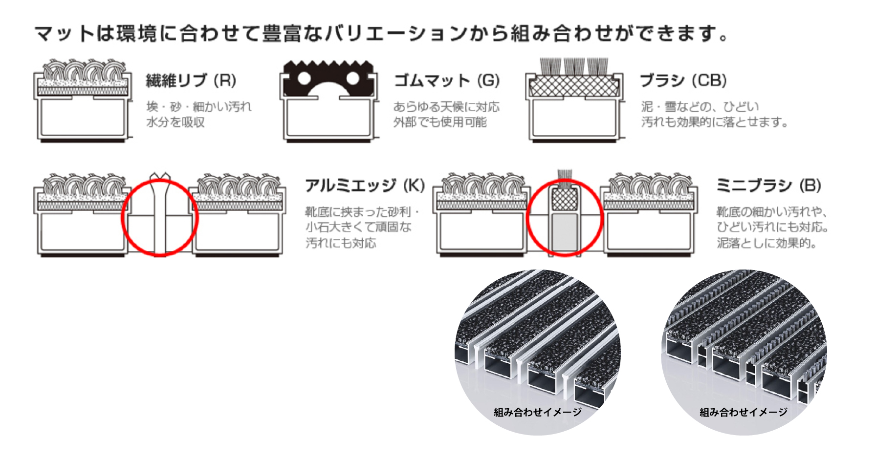 • 様々な環境の汚れに対応したマットの組み合わせが、靴底に付酒した泥・砂・埃・雪・雨などの