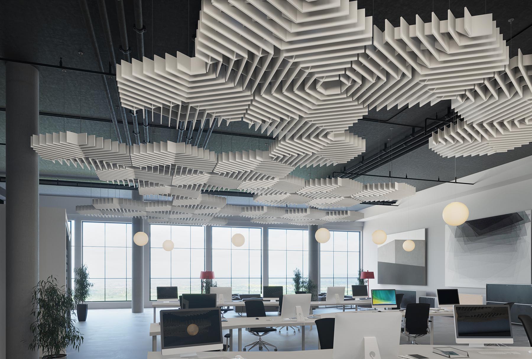 SOFTSOUNDは軽量で存在感のある吸音バッフルです。フェルト素材のパネルを立体的に組み上げるユニットは天井や壁に設置することで吸音したいエリアを「ゾーニング」できる機能的なアコースティックオブジェです。残響音をコントロールすることで五感へのストレス負担を抑制し、心地良く落ち着いた空間と時間を提供できます。また、音環境を整えるデザインは、人と人との良い関係をつくることであり、コミュニケーションを円滑にし、仕事の質を高め、プライバシーを守り、リラックスでき、そしてその場所が心地いいということです。残響音を抑えたい改修やリノベーションに使いやすく、あらわし天井でも印象的にも機能的にも整えることができます。